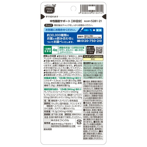 ファンケル 中性脂肪サポート 提供価格: 1,404 円~ 5,833 円 (税込)/ 1,300円~5,401円(税抜) バリエーションが 3 件あります 色、サイズ、入数など、1つの商品に複数のパターンがある商品をバリエーションといいます。表示する内容は、お好みで選択した条件で絞り込むこともできます。バリエーション一覧 バリエーションをすべて見る <パッケージ裏面> <機能性表示届出番号・届出表示> 画像をクリックすると拡大表示します 内容量:19.2g , 摂取の目安:1日4粒 , カロリー:3.2kcal , 栄養成分:たんぱく質:0.06g、脂質:0.02g、炭水化物:0.83g(糖質:0.55g、食物繊維:0.28g)、食塩相当量:0g、機能性関与成分/モノグルコシルヘスペリジン:350mg(モノグルコシルヘスペリジンは、糖転移ヘスペリジン500mgに含まれます。キトサン:100mg、クルクミン:20mg) , 原材料:[原材料]でんぷん(国内製造)、ウコンエキス [添加物]糖転移ヘスペリジン、セルロース、キトサン(かに由来)、ステアリン酸カルシウム , 表示すべきアレルギー項目:かに , 賞味期限:商品の発送時点で、賞味期限まで残り150日以上の商品をお届けします。 , 保存方法:直射日光と高温・多湿の場所を避けて保存してください。 , 注意事項:・妊娠/授乳中の方、お子様はお召し上がりにならないでください。・本品は、特定保健用食品と異なり、消費者庁長官による個別審査を受けたものではありません。・本品は、疾病の診断、治療、予防を目的としたものではありません。 , その他仕様:●形状:丸型タブレット●機能性表示食品●20日分 , 備考:※カロリー、栄養成分は4粒(960mg)あたり。※メーカー都合により、パッケージデザインおよび仕様が変更になる場合がございます。 商品仕様詳細 代表商品 ファンケル 中性脂肪サポート 20日分 1袋(80粒) 中性脂肪が高めの方に レビュー 0.0 (0件) レビューを書く お申込番号:069-3873 比較表に追加 気になる商品を選んで「比較表」にすることができます。チェックするとページ下部の「比較する商品一覧」に追加されます。商品を比較する 品番/型番:FN513474 メーカー名:ファンケル 軽減税率対象商品軽減税率対象商品です。 お取り寄せ商品ご注文いただいてから、メーカーまたは仕入先よりお取り寄せする商品です。 この商品の詳細を見る 提供価格1,404円(税込) 1,300円(税抜) 割引率 0% 獲得予定ポイント 26pt 注文数 1 2 3 4 5 6 7 8 9 10+ 個人限定 カートに入れる お気に入りに追加 お客様ご都合によるキャンセル・返品をお受けできない商品です。返品不可商品についてはリンク先より詳細をご確認ください。返品について ファンケル 中性脂肪サポートのバリエーション一覧 絞り込み 絞り込みを解除する 入数 1パック(360粒:120粒×3袋) 1袋(120粒) 1袋(80粒) 全3件(3商品) 1~3件を表示 並び替え 指定なし 価格の安い順 価格の高い順 評価が高い順 メーカー名順 商品名順 表示切替 10件 20件 50件 100件 比較表 気になる商品を選んで「比較表」にすることができます。チェックするとページ下部の「比較する商品一覧」に追加されます。商品を比較する 商品情報 入数 提供価格 ファンケル 中性脂肪サポート 20日分 1袋(80粒) 軽減税率対象商品軽減税率対象商品です。 お取り寄せ商品ご注文いただいてから、メーカーまたは仕入先よりお取り寄せする商品です。 0.0 お申込番号 :069-3873 品番/型番:FN513474 メーカー名:ファンケル 1袋(80粒) 提供価格 1,404円(税込) 1,300円(税抜) 1粒あたり 17.6円(税込) 1 2 3 4 5 6 7 8 9 10+ 個人限定 カートに入れる お気に入りに追加 ファンケル 中性脂肪サポート 30日分 1袋(120粒) 軽減税率対象商品軽減税率対象商品です。 お取り寄せ商品ご注文いただいてから、メーカーまたは仕入先よりお取り寄せする商品です。 0.0 お申込番号 :069-3880 品番/型番:FN466701 メーカー名:ファンケル 1袋(120粒) 提供価格 2,047円(税込) 1,896円(税抜) 1粒あたり 17.1円(税込) 1 2 3 4 5 6 7 8 9 10+ 個人限定 カートに入れる お気に入りに追加 ファンケル 中性脂肪サポート 90日分/パック 1パック(360粒:120粒×3袋) 軽減税率対象商品軽減税率対象商品です。 お取り寄せ商品ご注文いただいてから、メーカーまたは仕入先よりお取り寄せする商品です。 0.0 お申込番号 :069-3897 品番/型番:FN477721 メーカー名:ファンケル 1パック(360粒:120粒×3袋) 提供価格 5,833円(税込) 5,401円(税抜) 1粒あたり 16.3円(税込) 1 2 3 4 5 6 7 8 9 10+ 個人限定 カートに入れる お気に入りに追加 この商品を見た人は、こんな商品も見ています この商品を買った人は、こんな商品も買っています サプリメントのカテゴリー サプリメント 栄養バランス食品 栄養バランス飲料 その他栄養補助食品 戻る ホーム 食品・飲料 栄養補助食品 サプリメント ファンケル 中性脂肪サポート あなたが最近チェックした商品 もっと見る 話題のキーワード マスク 2026年版カレンダー コーヒー 蛍光ペン トイレットペーパー 付箋 ホワイトボードマーカー クリップ 商品名商品名商品名商品名商品名商品名商品名商品名商品名 上記の商品を●点カートに投入しました! 上記の商品を●