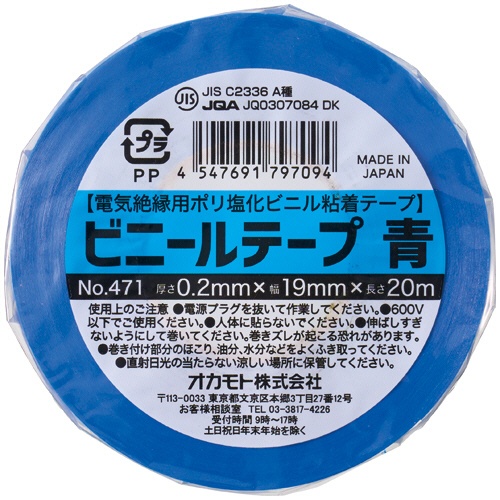 オカモト ビニールテープ No.471 19mm×20m 提供価格: 432 円~ 5,054 円 (税込)/ 400円~4,680円(税抜) バリエーションが 2 件あります 色、サイズ、入数など、1つの商品に複数のパターンがある商品をバリエーションといいます。表示する内容は、お好みで選択した条件で絞り込むこともできます。バリエーション一覧 バリエーションをすべて見る 画像をクリックすると拡大表示します 種類:ビニールテープ , 寸法:幅19mm×長さ20m , 厚さ:0.2mm , 色:青 , 材質:基材:ポリ塩化ビニル、粘着剤:ゴム系粘着剤 商品仕様詳細 「たのめーる」カタログ vol.54 528ページ 代表商品 オカモト ビニールテープ No.471 19mm×20m 青 1巻 たっぷり使える20m巻き!安心の日本製。 レビュー 0.0 (0件) レビューを書く お申込番号:460-7159 比較表に追加 気になる商品を選んで「比較表」にすることができます。チェックするとページ下部の「比較する商品一覧」に追加されます。商品を比較する 品番/型番:No471-19x20アオ メーカー名:オカモト 軽減税率対象商品軽減税率対象商品です。 新登場商品最近1ヶ月以内にたのめーるWebサイトで新しく取り扱いを開始した商品です。 カタログ新規掲載商品たのめーるカタログで新しく取り扱いを開始した商品です。 この商品の詳細を見る 提供価格162円(税込) 148円(税抜) 獲得予定ポイント 2pt 注文数 1 2 3 4 5 6 7 8 9 10+ カートに入れる お気に入りに追加 ご利用規約に基づき、返品を受け承る商品です。返品についてはリンク先より詳細をご確認ください。返品について オカモト ビニールテープ No.471 19mm×20mのバリエーション一覧 絞り込み 絞り込みを解除する 入数 全2件(2商品) 1~2件を表示 並び替え 指定なし 価格の安い順 価格の高い順 評価が高い順 メーカー名順 商品名順 表示切替 10件 20件 50件 100件 比較表 気になる商品を選んで「比較表」にすることができます。チェックするとページ下部の「比較する商品一覧」に追加されます。商品を比較する 商品情報 入数 提供価格 森白製菓 森のちーず屋さん 55g 1パック 軽減税率対象商品軽減税率対象商品です。 新登場商品最近1ヶ月以内にたのめーるWebサイトで新しく取り扱いを開始した商品です。 カタログ新規掲載商品たのめーるカタログで新しく取り扱いを開始した商品です。 0.0 お申込番号 :460-3151 品番/型番:030269 メーカー名:森白製菓 1パック 提供価格 432円(税込) 400円(税抜) 1パックあたり 432円(税込) 1 2 3 4 5 6 7 8 9 10+ カートに入れる お気に入りに追加 森白製菓 森のちーず屋さん 55g 1セット(12パック) 軽減税率対象商品軽減税率対象商品です。 まとめ買いまとめ買いでお買い得になる商品の目印です。 新登場商品最近1ヶ月以内にたのめーるWebサイトで新しく取り扱いを開始した商品です。 カタログ新規掲載商品たのめーるカタログで新しく取り扱いを開始した商品です。 0.0 お申込番号 :965-1962 品番/型番:030269 メーカー名:森白製菓 1セット(12パック) 提供価格 5,054円(税込) 4,680円(税抜) 1パックあたり 421.2円(税込) 1 2 3 4 5 6 7 8 9 10+ カートに入れる お気に入りに追加 この商品を見た人は、こんな商品も見ています この商品を買った人は、こんな商品も買っています 米菓子・せんべいのカテゴリー スナック菓子 豆菓子・おつまみ・珍味 米菓子・せんべい チョコレート クッキー・ビスケット 飴・キャンディ ガム お菓子詰合せ 生菓子(和洋菓子) グミ・キャラメル・ラムネ タブレット ゼリー・プリン その他お菓子 戻る ホーム 食品・飲料 お菓子 米菓子・せんべい オカモト ビニールテープ No.471 19mm×20m あなたが最近チェックした商品 もっと見る 話題のキーワード マスク 2026年版カレンダー コーヒー ボールペン クリップ リングファイル ファイル パイプ式ファイル 紙コップ 商品名商品名商品名商品名商品名商品名商品名商品名商品名 上記の商品を●点カートに投入しました! 上記の商品を●点カートに投入しました! ●点を超える場合は、ご注文いただけません。 ##価格ご相談商品です。お問い合わせフォームまたはお電話にてお問い合わせください。 ## ## ## #if($userLoginDto.isLogin() && $userLoginDto.propertyEquals("hojinKojinKbn", "1")) ## お問い合わせフォーム ## ## #else ## お問い合わせフォーム ## ## #end ## ## ## ## たのめーるインフォメーション ## ## ## ## #if($userLoginDto.isLogin() && $userLoginDto.propertyEquals("hojinKojinKbn", "1")) ## 個人様向けお問い合わせ窓口 ## #else ## 法人様向けお問い合わせ窓口 ## #end ## ## ##【SI-803】 Start インフォメーションの電話番号統一化 ## $!esc.html($!userLoginDto.getProperty("kousiteQTelno")) ##【SI-803】 End インフォメーションの電話番号統一化 ## ## ## 受付時間:月曜~土曜 午前8時~午後8時(日曜・祝祭日・年末年始を除く) ## ## ## 閉じる 比較表を見る クリア 開く ログインし直しますか? はい いいえ ログアウトしますか? はい いいえ 別のIDでログインし直す方はこちら ログイン画面へ 使用許諾の同意 以下の内容を確認の上、「同意する」を選択してください。 同意する