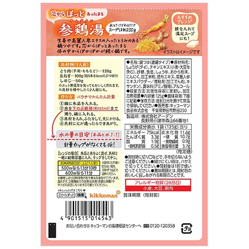 キッコーマン 芯からぽっと 125g(1-2人前) 提供価格: 185 円~ 185 円 (税込)/ 172円~172円(税抜) バリエーションが 3 件あります 色、サイズ、入数など、1つの商品に複数のパターンがある商品をバリエーションといいます。表示する内容は、お好みで選択した条件で絞り込むこともできます。バリエーション一覧 バリエーションをすべて見る <パッケージ裏面> 画像をクリックすると拡大表示します 種類:鍋スープ , 味:参鶏湯 , 形状:液体(濃縮タイプ) , 人数:1~2人前 , 内容量:125g , 栄養成分:エネルギー:75kcal、たんぱく質:3.3g、脂質:1.9g(飽和脂肪酸:0.5g)、炭水化物:11.6g(糖質:10.7g、食物繊維:0.9g)、食塩相当量:3.7g , 原材料:[原材料]しょうが(タイ)、チキンエキス(小麦・大豆を含む)、砂糖、食塩、しょうゆ、おから粉末、にんにく、加工米粉、昆布エキス、高麗人参エキスパウダー [添加物]増粘剤(加工でん粉、キサンタン)、調味料(アミノ酸等)、アルコール , 表示すべきアレルギー項目:小麦、大豆、鶏肉 , 賞味期限:商品の発送時点で、賞味期限まで残り130日以上の商品をお届けします。 , 製造国:日本 , 保存方法:直射日光を避けて常温で保存してください , 備考:※栄養成分は1パックあたり。※メーカー都合により、パッケージデザインおよび仕様が変更になる場合がございます。 商品仕様詳細 代表商品 キッコーマン 芯からぽっと 参鶏湯 125g(1-2人前) 1パック 芯からぽっと温まり、ぽかぽかが続く鍋つゆです。 レビュー 0.0 (0件) レビューを書く お申込番号:464-9739 比較表に追加 気になる商品を選んで「比較表」にすることができます。チェックするとページ下部の「比較する商品一覧」に追加されます。商品を比較する 品番/型番:014543 メーカー名:キッコーマン 軽減税率対象商品軽減税率対象商品です。 期間限定値下げ商品期間限定のお買い得品です。 この商品の詳細を見る 在庫状況:品切れ 提供価格185円(税込) 172円(税抜) 割引率 13% 獲得予定ポイント 2pt 注文数 1 2 3 4 5 6 7 8 9 10+ 個人限定 カートに入れる お気に入りに追加 お客様ご都合によるキャンセル・返品をお受けできない商品です。返品不可商品についてはリンク先より詳細をご確認ください。返品について キッコーマン 芯からぽっと 125g(1-2人前)のバリエーション一覧 絞り込み 絞り込みを解除する 味 参鶏湯 生姜みぞれ鍋 麻辣火鍋 全3件(3商品) 1~3件を表示 並び替え 指定なし 価格の安い順 価格の高い順 評価が高い順 メーカー名順 商品名順 表示切替 10件 20件 50件 100件 比較表 気になる商品を選んで「比較表」にすることができます。チェックするとページ下部の「比較する商品一覧」に追加されます。商品を比較する 商品情報 味 提供価格 キッコーマン 芯からぽっと 参鶏湯 125g(1-2人前) 1パック 軽減税率対象商品軽減税率対象商品です。 期間限定値下げ商品期間限定のお買い得品です。 0.0 お申込番号 :464-9739 品番/型番:014543 メーカー名:キッコーマン 在庫状況:品切れ 参鶏湯 提供価格 185円(税込) 172円(税抜) 1パックあたり 185円(税込) 1 2 3 4 5 6 7 8 9 10+ 個人限定 カートに入れる お気に入りに追加 キッコーマン 芯からぽっと 麻辣火鍋 125g(1-2人前) 1パック 軽減税率対象商品軽減税率対象商品です。 期間限定値下げ商品期間限定のお買い得品です。 0.0 お申込番号 :464-9746 品番/型番:014567 メーカー名:キッコーマン 在庫状況:品切れ 麻辣火鍋 提供価格 185円(税込) 172円(税抜) 1パックあたり 185円(税込) 1 2 3 4 5 6 7 8 9 10+ 個人限定 カートに入れる お気に入りに追加 キッコーマン 芯からぽっと 生姜みぞれ鍋 125g(1-2人前) 1パック 軽減税率対象商品軽減税率対象商品です。 期間限定値下げ商品期間限定のお買い得品です。 0.0 お申込番号 :464-9753 品番/型番:014581 メーカー名:キッコーマン 在庫状況:品切れ 生姜みぞれ鍋 提供価格 185円(税込) 172円(税抜) 1パックあたり 185円(税込) 1 2 3 4 5 6 7 8 9 10+ 個人限定 カートに入れる お気に入りに追加 この商品を見た人は、こんな商品も見ています この商品を買った人は、こんな商品も買っています 鍋スープのカテゴリー 食用油 たれ・つゆ 醤油・みそ だし・コンソメ 塩・香辛料・薬味 マヨネーズ・ソース・ケチャップ 中華・エスニック調味料 ドレッシング・ディップ 料理の素・合わせ調味料・ルー 鍋スープ その他調味料 戻る ホーム 食品・飲料 調味料 鍋スープ キッコーマン 芯からぽっと 125g(1-2人前) あなたが最近チェックした商品 もっと見る 話題のキーワード 2026年版カレンダー マスク コーヒー お茶 ジェットストリーム クリアホルダー お菓子 クリアファイル フラットファイル 商品名商品名商品名商品名商品名商品名商品名商品名商品名 上記の商品を●点カートに投入しました! 上記の商品を●点カートに投入しました! ●点を超える場合は、ご注文いただけません。 ##価格ご相談商品です。お問い合わせフォームまたはお電話にてお問い合わせください。 ## ## ## #if($userLoginDto.isLogin() && $userLoginDto.propertyEquals("hojinKojinKbn", "1")) ## お問い合わせフォーム ## ## #el