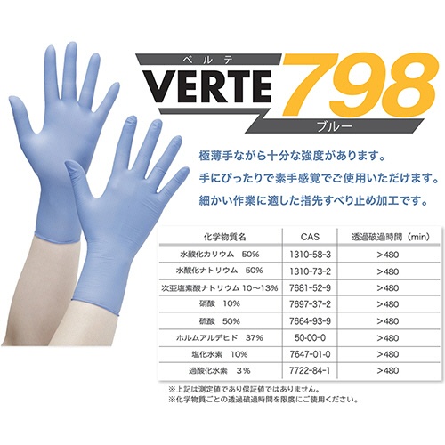 ミドリ安全 ニトリル使い捨て手袋 極薄手タイプ ベルテ798 提供価格: 1,878 円~ 1,878 円 (税込)/ 1,708円~1,708円(税抜) バリエーションが 5 件あります 色、サイズ、入数など、1つの商品に複数のパターンがある商品をバリエーションといいます。表示する内容は、お好みで選択した条件で絞り込むこともできます。バリエーション一覧 バリエーションをすべて見る 画像をクリックすると拡大表示します サイズ:L , 寸法:全長230±10×手のひらの幅107±4mm , パウダー有無:なし , 左右兼用:兼用 , 色:ブルー , 材質:ニトリルゴム , 生産国:マレーシア 商品仕様詳細 代表商品 ミドリ安全 ニトリル使い捨て手袋 極薄手タイプ ベルテ798(極薄手)L 粉なし VERTE-798-L 1箱(200枚) 手にぴったりで素手感覚で使える、極薄手タイプ。極薄手ながら十分な強度があります。 レビュー 0.0 (0件) レビューを書く お申込番号:232-8455 比較表に追加 気になる商品を選んで「比較表」にすることができます。チェックするとページ下部の「比較する商品一覧」に追加されます。商品を比較する 品番/型番:VERTE-798-L メーカー名:ミドリ安全 ケアたのめーるケアたのめーる介護用品カテゴリーの商品です。 お取り寄せ商品ご注文いただいてから、メーカーまたは仕入先よりお取り寄せする商品です。 この商品の詳細を見る 在庫状況:お取り寄せ商品 提供価格1,878円(税込) 1,708円(税抜) 獲得予定ポイント 34pt 注文数 1 2 3 4 5 6 7 8 9 10+ 法人限定 カートに入れる お気に入りに追加 お客様ご都合によるキャンセル・返品をお受けできない商品です。返品不可商品についてはリンク先より詳細をご確認ください。返品について ミドリ安全 ニトリル使い捨て手袋 極薄手タイプ ベルテ798のバリエーション一覧 絞り込み 絞り込みを解除する サイズ規格 L LL M S SS 全5件(5商品) 1~5件を表示 並び替え 指定なし 価格の安い順 価格の高い順 評価が高い順 メーカー名順 商品名順 表示切替 10件 20件 50件 100件 比較表 気になる商品を選んで「比較表」にすることができます。チェックするとページ下部の「比較する商品一覧」に追加されます。商品を比較する 商品情報 サイズ規格 提供価格 ミドリ安全 ニトリル使い捨て手袋 極薄手タイプ ベルテ798(極薄手)SS 粉なし VERTE-798-SS 1箱(200枚) ケアたのめーるケアたのめーる介護用品カテゴリーの商品です。 お取り寄せ商品ご注文いただいてから、メーカーまたは仕入先よりお取り寄せする商品です。 0.0 お申込番号 :232-8434 品番/型番:VERTE-798-SS メーカー名:ミドリ安全 在庫状況:お取り寄せ商品 SS 提供価格 1,878円(税込) 1,708円(税抜) 1枚あたり 9.4円(税込) 1 2 3 4 5 6 7 8 9 10+ 法人限定 カートに入れる お気に入りに追加 ミドリ安全 ニトリル使い捨て手袋 極薄手タイプ ベルテ798(極薄手)S 粉なし VERTE-798-S 1箱(200枚) ケアたのめーるケアたのめーる介護用品カテゴリーの商品です。 お取り寄せ商品ご注文いただいてから、メーカーまたは仕入先よりお取り寄せする商品です。 0.0 お申込番号 :232-8441 品番/型番:VERTE-798-S メーカー名:ミドリ安全 在庫状況:お取り寄せ商品 S 提供価格 1,878円(税込) 1,708円(税抜) 1枚あたり 9.4円(税込) 1 2 3 4 5 6 7 8 9 10+ 法人限定 カートに入れる お気に入りに追加 ミドリ安全 ニトリル使い捨て手袋 極薄手タイプ ベルテ798(極薄手)M 粉なし VERTE-798-M 1箱(200枚) ケアたのめーるケアたのめーる介護用品カテゴリーの商品です。 お取り寄せ商品ご注文いただいてから、メーカーまたは仕入先よりお取り寄せする商品です。 0.0 お申込番号 :232-8448 品番/型番:VERTE-798-M メーカー名:ミドリ安全 在庫状況:お取り寄せ商品 M 提供価格 1,878円(税込) 1,708円(税抜) 1枚あたり 9.4円(税込) 1 2 3 4 5 6 7 8 9 10+ 法人限定 カートに入れる お気に入りに追加 ミドリ安全 ニトリル使い捨て手袋 極薄手タイプ ベルテ798(極薄手)L 粉なし VERTE-798-L 1箱(200枚) ケアたのめーるケアたのめーる介護用品カテゴリーの商品です。 お取り寄せ商品ご注文いただいてから、メーカーまたは仕入先よりお取り寄せする商品です。 0.0 お申込番号 :232-8455 品番/型番:VERTE-798-L メーカー名:ミドリ安全 在庫状況:お取り寄せ商品 L 提供価格 1,878円(税込) 1,708円(税抜) 1枚あたり 9.4円(税込) 1 2 3 4 5 6 7 8 9 10+ 法人限定 カートに入れる お気に入りに追加 ミドリ安全 ニトリル使い捨て手袋 極薄手タイプ ベルテ798(極薄手)LL 粉なし VERTE-798-LL 1箱(200枚) ケアたのめーるケアたのめーる介護用品カテゴリーの商品です。 お取り寄せ商品ご注文いただいてから、メーカーまたは仕入先よりお取り寄せする商品です。 0.0 お申込番号 :232-8462 品番/型番:VERTE-798-LL メーカー名:ミドリ安全 在庫状況:お取り寄せ商品 LL 提供価格 1,878円(税込) 1,708円(税抜) 1枚あたり 9.4円(税込) 1 2 3 4 5 6 7 8 9 10+ 法人限定 カートに入れる お気に入りに追加 この商品を見た人は、こんな商品も見ています この商品を買った人は、こんな商品も買っています 合成ゴム(ニトリル)のカテゴリー 塩化ビニール(PVC) 天然ゴム(ラテックス) 合成ゴム(ニトリル) ポリエチレン そ